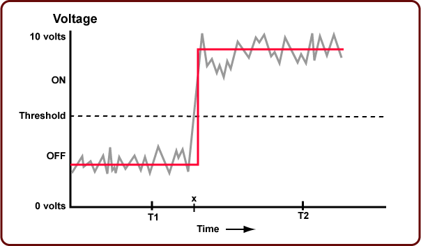 Something might be wrong here. Is the signal is "on" or "off" at the time "x"? This is not easy to tell. What is worse, a different amount of noise changes the answer. What can be done about this problem? (Hint: must the value of the signal be known at all times?)