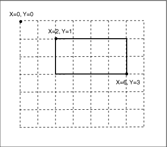 A computer aided design program expects users to enter the coordinates two corners for each of several of rectangles (see diagram.) The sides of the rectangles are assumed to be parallel to the X and Y axes. The coordinates of each corner is entered as a pair of integers, first the X coordinate and then the Y coordinate. The origin of the coordinate system (0,0) is in the upper left, so Y increases going downward, and X increases to the right.