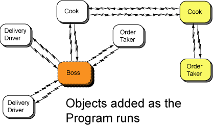 Object-oriented programs can create more objects as the program runs. The new objects might be needed to handle additional data that the program needs to work with. The picture shows your business after few more employees have been added.