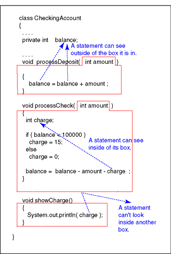 It is sometimes useful to visualize methods as surrounded by a box of "one-way glass." A method can see local variables and parameters that are inside the box. A method can see out of the glass that surrounds it. But no outsider can see into the box.