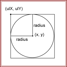 If you know the center of the circle, (x, y) and radius, you can calculate the coordinates of the upperleft corner of the square that contains the circle, and its width and height. Here is a picture to help: