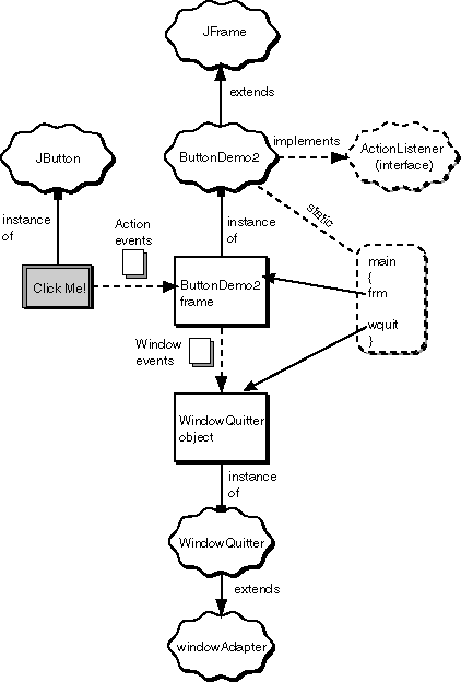 ButtonDemo2 frame is registered as a listener for Action Events.ButtonDemo2 class implements ActionListener.WindowQuitter object.