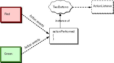 The picture shows the present situation. Event objects from both buttons are delivered to the same method, which changes the background to blue no matter what event it receives.