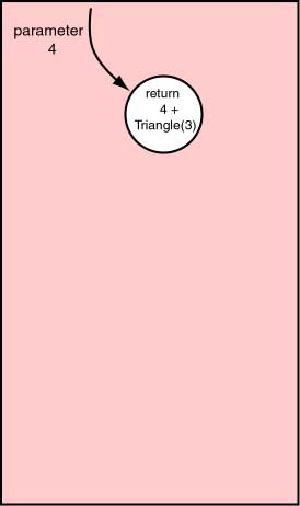 Click on the diagram shows the steps of the computation. Each activation of the method is represented by a circle. Each activation has its own parameter and returns a value to its caller.