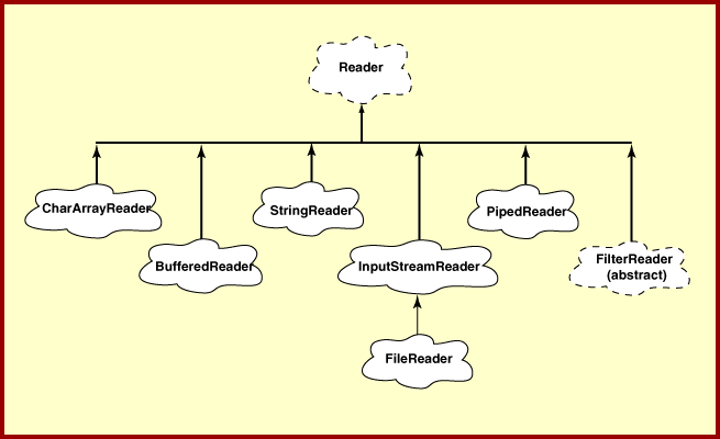 Reader is an abstract class from which all character-oriented input streams are derived. These streams are aimed at delivering 16-bit char data to a program, although the source of the data may be in a different format (such as UTF format on a disk file). The diagram shows several Reader classes.