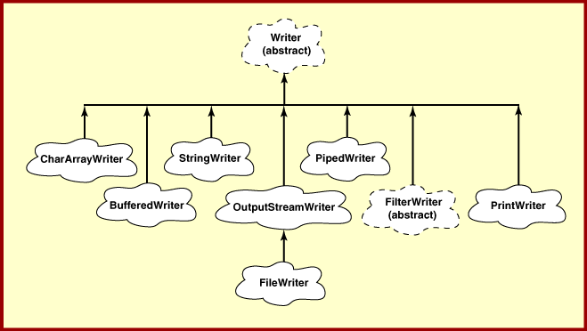Class FileWriter is used for output of character data to a disk file. Here is where it is in the hierarchy of Writer classes:
