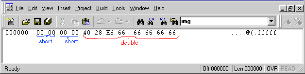 A dump of the new file is indistinguishable from that of the previous file. A program that reads data from this file must be written with the knowledge of how the file was written. (Of course, since I know how it was written the brackets under the bytes show the intended groupings).